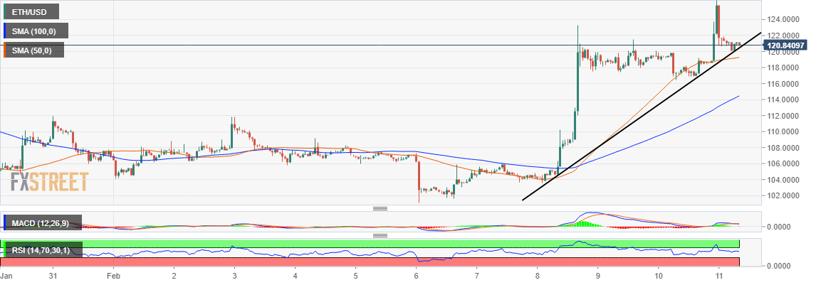 The market is back in red following a weekend of stability. Ethereum alongside other digital assets corrected higher on Friday last week recording gains from the short-term support at $102 to monthly highs at $126.44. While the marker has started to trim the gains, Ethereum is staying above $120 support.