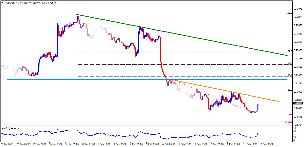 - However, the sellers continue to lurk ahead of the short-term descending trend-line resistance, at 0.7095, that connects highs marked since last Wednesday.