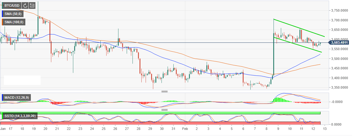 In the last few days, the largest cryptocurrency by market capitalization has battled to ensure that bears do not breach the short-term support at $3,550. In so doing a bullish flag pattern has formed in the 3-hour range. While BTC is exchanging hands at $3,581 I expect a breakout in the short-term as long as the bulls can pull the price above $3,600.