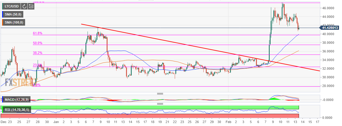 • The 61.8% Fibonacci level support in danger as Litecoin creeps towards $40.00.