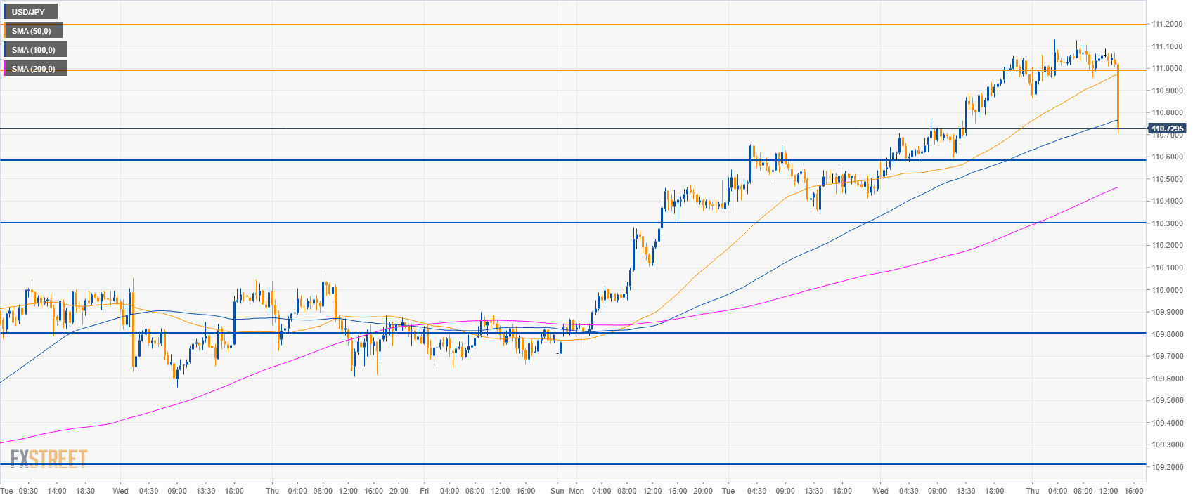 - USD/JPY dropped below the 111.00 figure and the 50 SMA. It is now testing the 100 SMA.