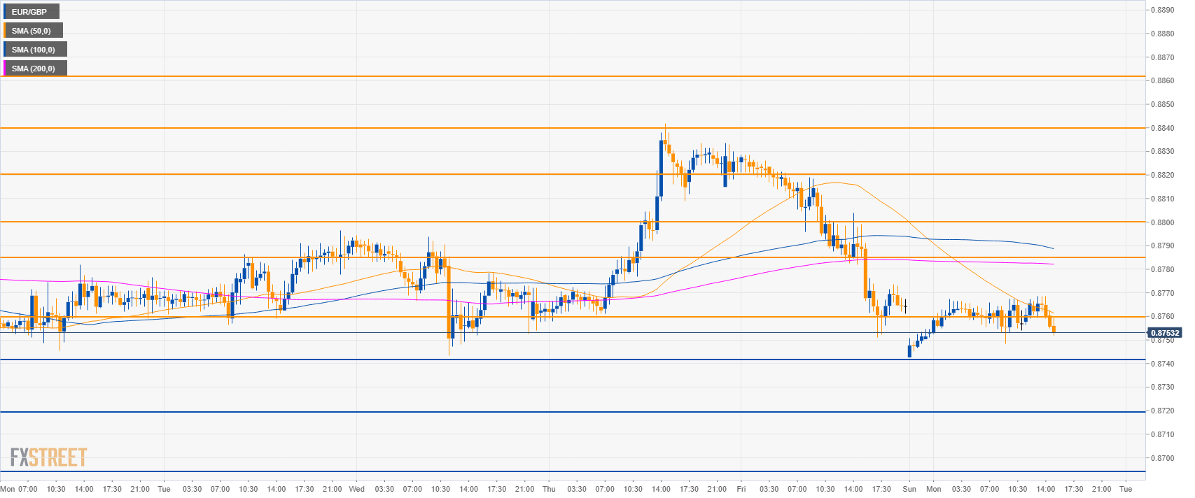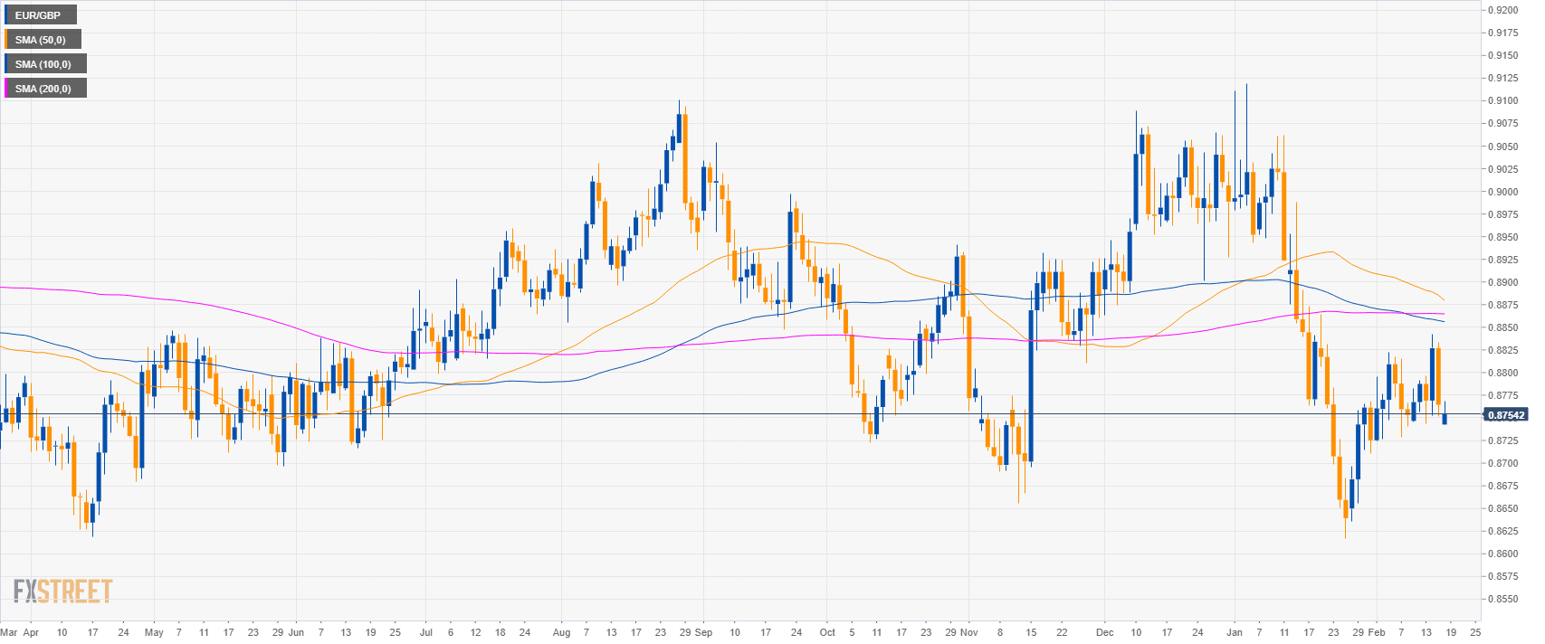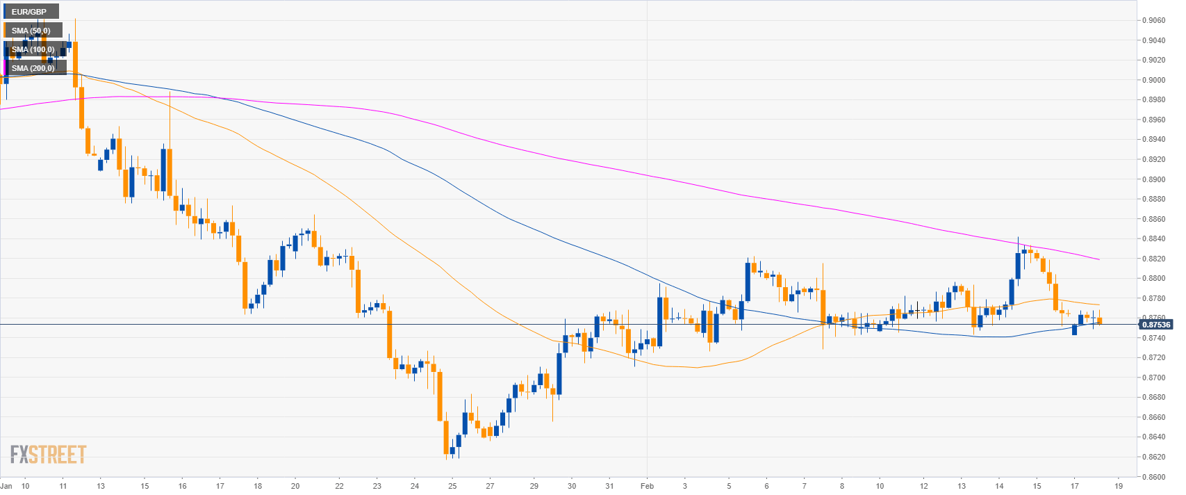 - EUR/GBP is trading between the 50 and 100 SMAs on the 4-hour chart suggesting a sideways market in the medium-term.