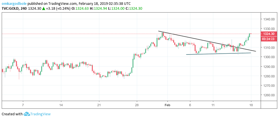 Gold is fast closing on a year-to-date high of $1,326 reached on Jan. 31 and may break higher toward $1,354 (100-month moving average) if trade optimism continues to hurt the US dollar.
