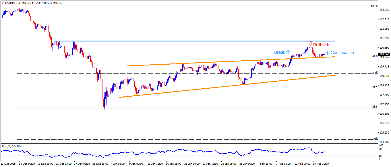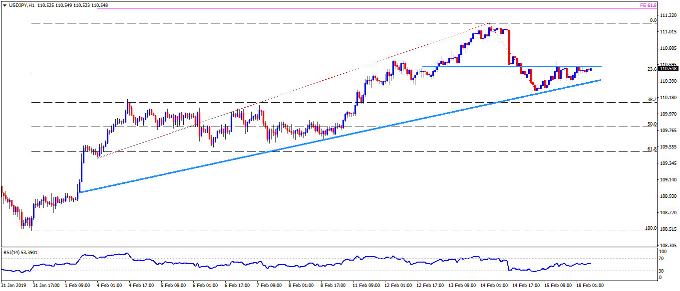 - Meanwhile, an ascending trend-line connecting month’s lows since February 01, at 110.35, can limit the pair’s adjacent declines, a break of which might not hesitate to recall 110.25 and 110.10 on the chart.