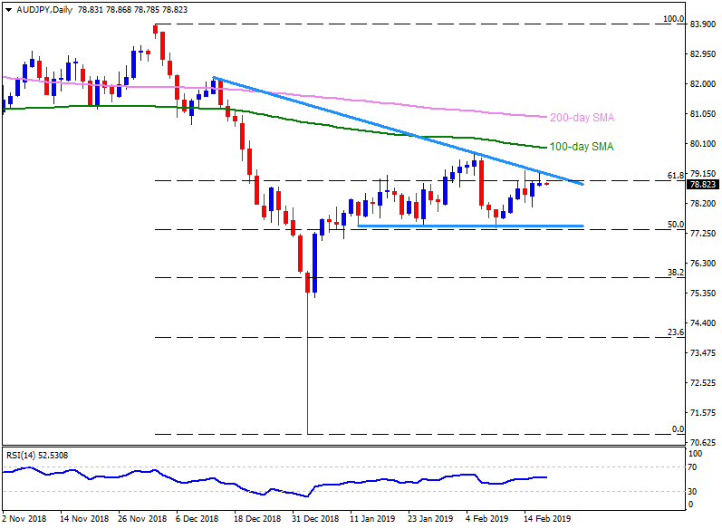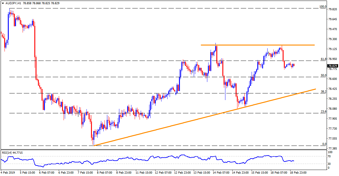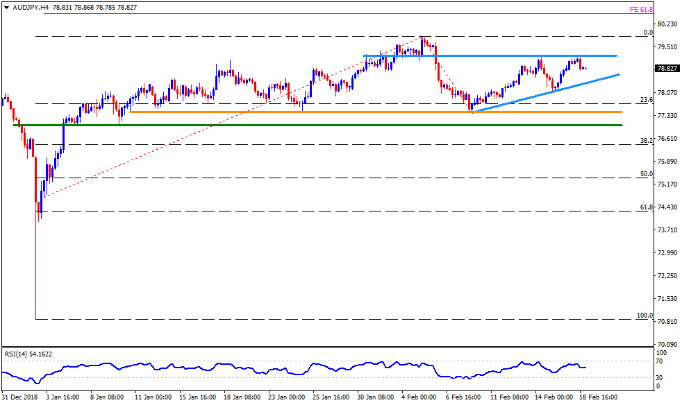 - 50% Fibonacci retracement of Feb 05-08 downturn, at 78.60, becomes adjacent support on H1 prior to fetching the quote to 78.30 support-line.