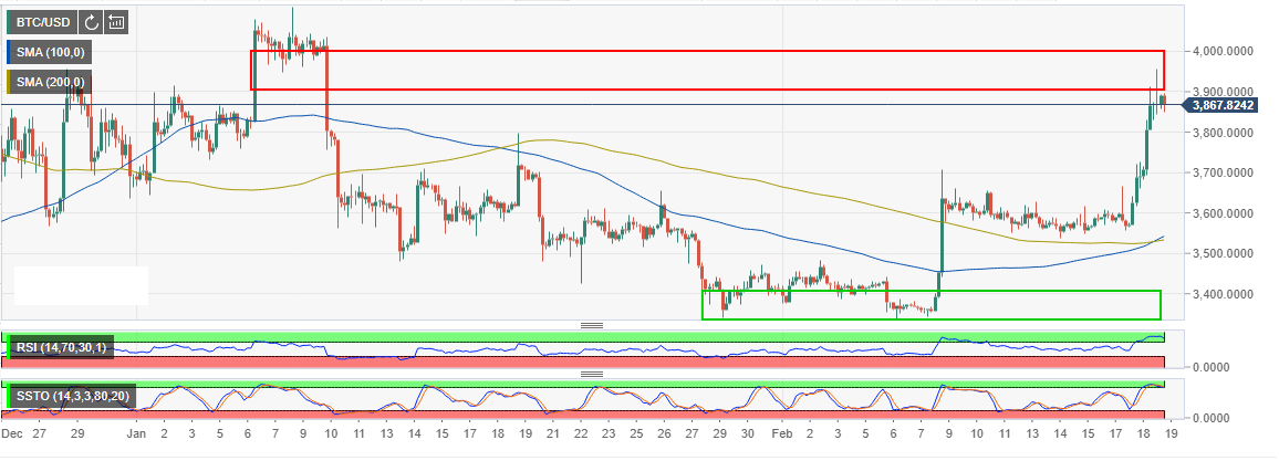 Bitcoin spiked in gains from the range support between $3,550 and $3,700. The asset spiked further above $3,900 and approached $4,000. The gains exceeded 5% before the correction started. Bitcoin momentum has slowed down from the gains in the last two days which means that a break above $4,000 will not  happen in the short-term.