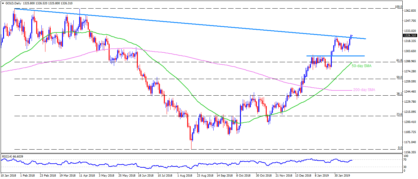 - Meanwhile, a downside break of resistance-turned-support connecting highs marked since 2018, at $1322, can offer immediate rest.
