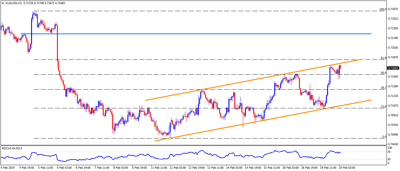 - However, resistance-line of an upward sloping trend-channel stretched since February 12, at 0.7180, coupled with oversold levels of 14-bar relative strength index (RSI), can disappoint the Aussie bulls.
