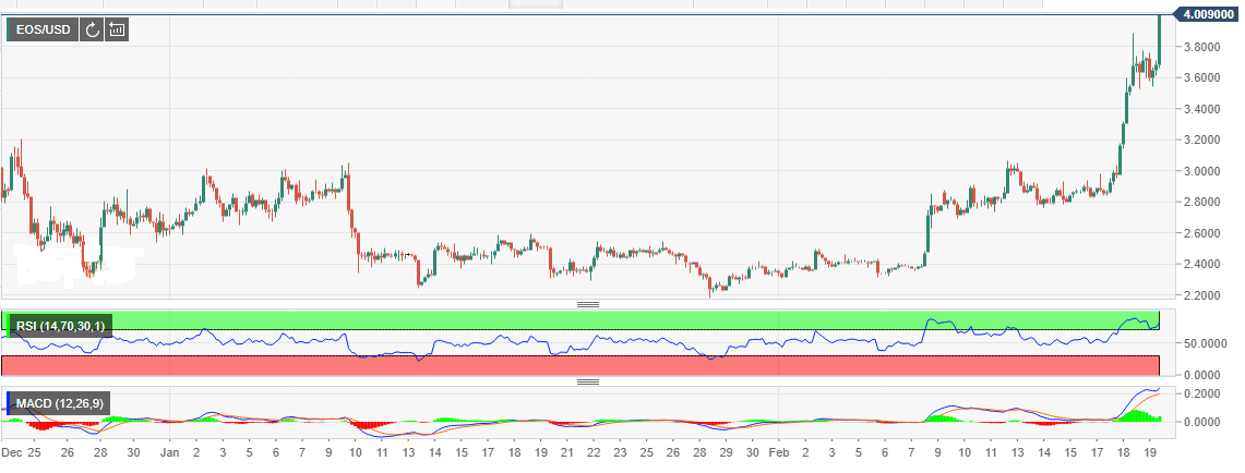 As the majority of cryptocurrencies fall back from the weekly high, EOS is an upward trajectory unbothered by the bearish pressure across the market. The crypto has added more than 8% on its value today. Besides, it has stepped above $4.0 for the first time since November 2018.