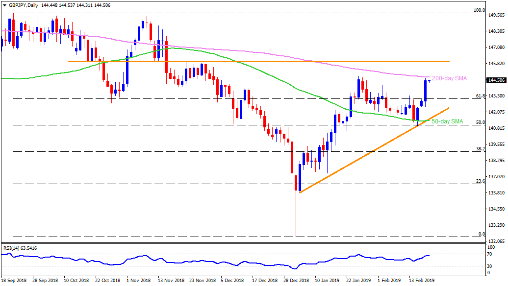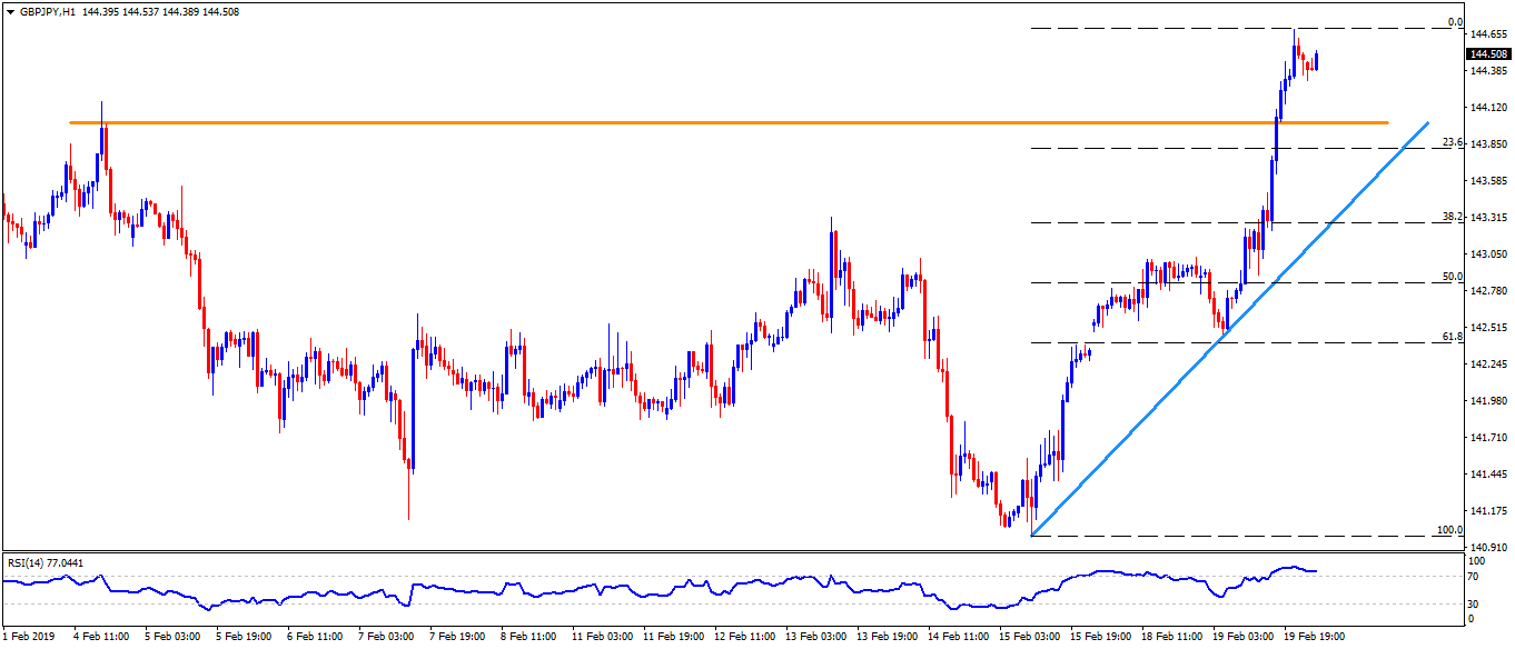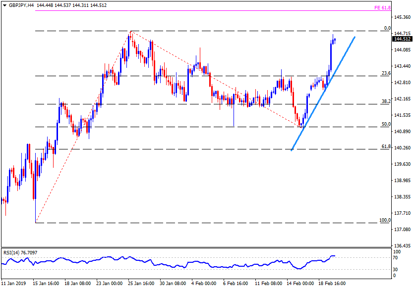 - If the pair rallies past-144.85, 61.8% Fibonacci expansion of its one month move ending on mid-February, at 145.60, can please buyers.