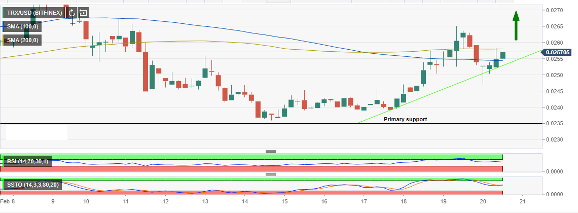 At press time, Tron is trading at $0.0257 following a slight retracement of 0.98% on the last 24-hours. The gains on Monday pulled the crypto value above $0.026 but failed to correct above $0.0265. A lower correction that ensued yesterday was supported at $0.0250. Tron is currently dancing between the 4-hour 100-day Simple Moving Average (SMA) resistance and the 50-day SMA support. The growing bullish trend is supported by the technical indicators like the RSI and the MACD, both of which have changed direction to the upside. Tron is expected to correct higher above $0.026 and even challenge the resistance at $0.0265 in the short-term.