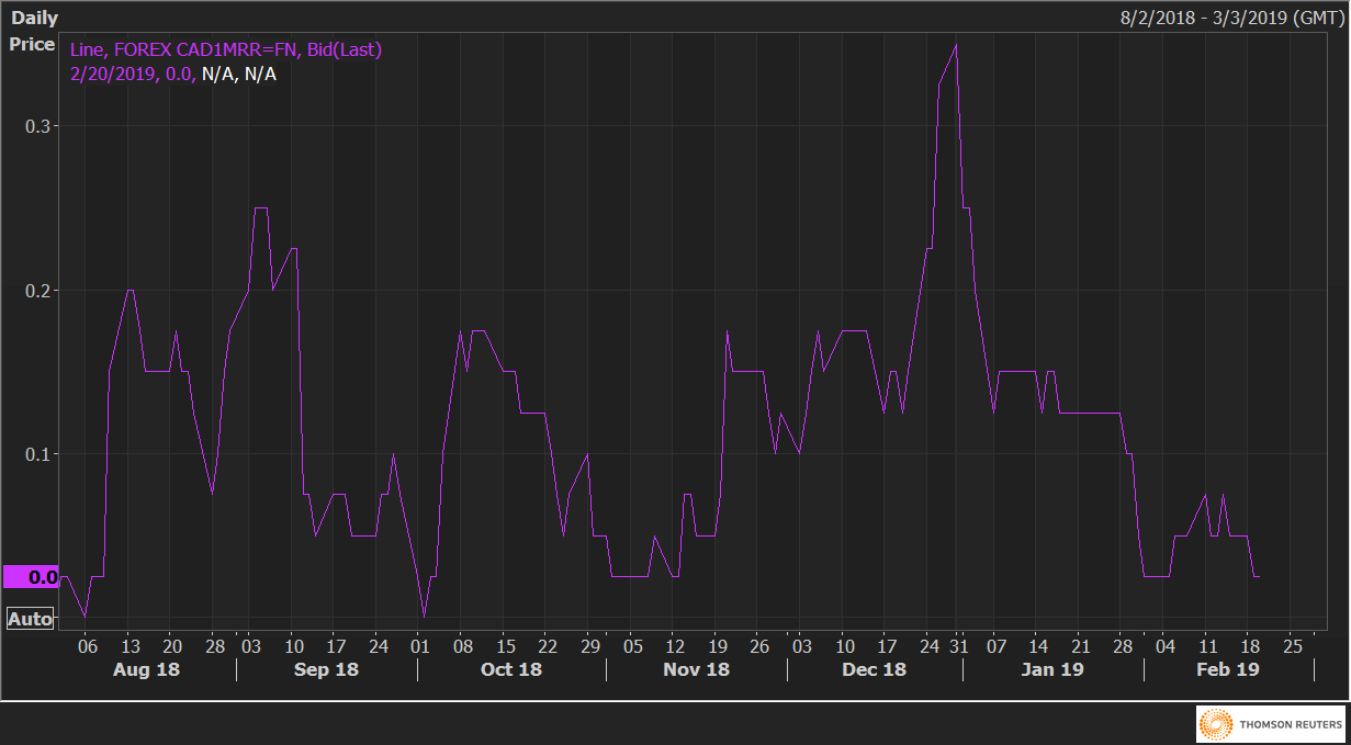 As of writing, one-month risk reversals are seen at 0.0 vs 0.10 seen nine days ago. The gauge stood at 0.4 in favor of USD/CAD calls (CAD puts) on Dec. 31.