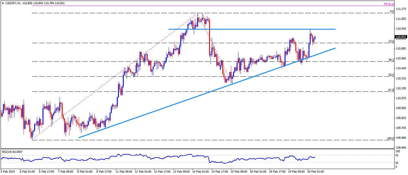 • If bulls conquer 110.95 barrier, recent highs of 111.15 and 61.8% Fibonacci retracement of February 06 to 15 moves, at 111.25, can flash on their radar to target.