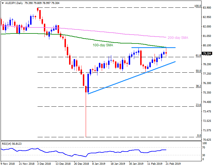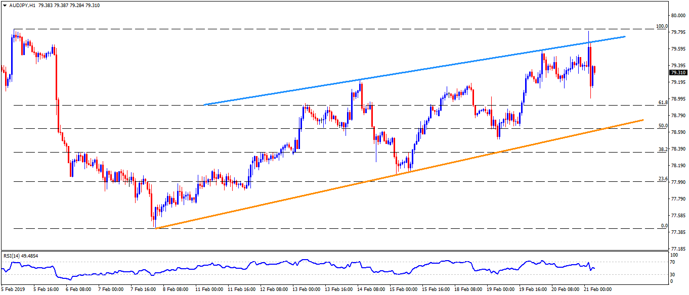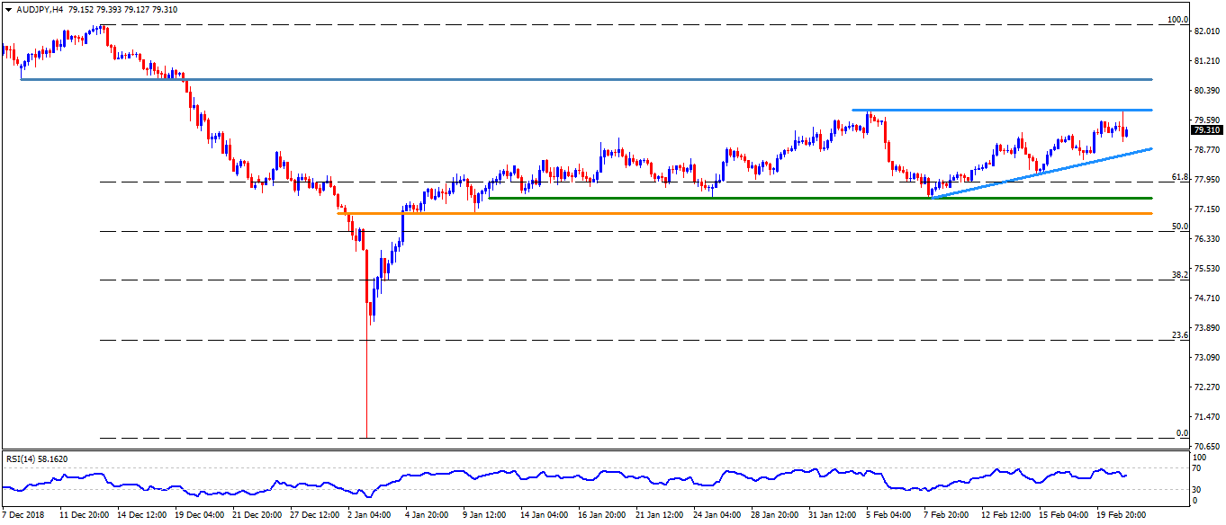 • An ascending trend-line connecting high  marked on February 14 and 20, at 79.70, may become immediate resistance for the pair ahead of highlighting the 79.80-90 area.