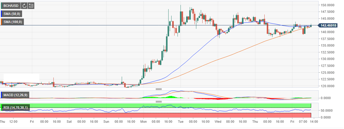 Bitcoin Cash currently trades at $142.24 1.27% higher on the day. It has recovered from the support at $137 and is immediately supported by the hourly 100-day Simple Moving Average (SMA) as well as the 50-day SMA in the same range.