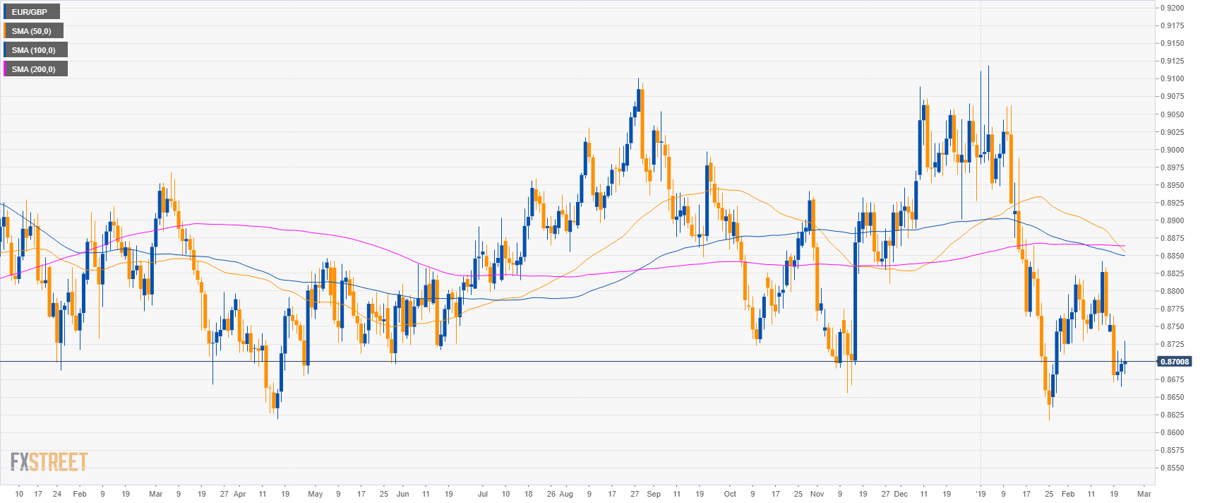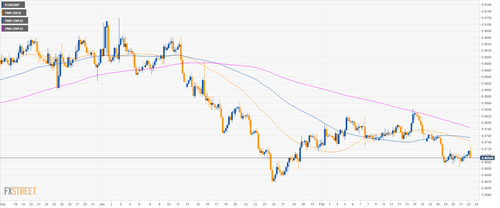 • EUR/GBP is in a sideways trend below the 200-day simple moving averages (SMA).