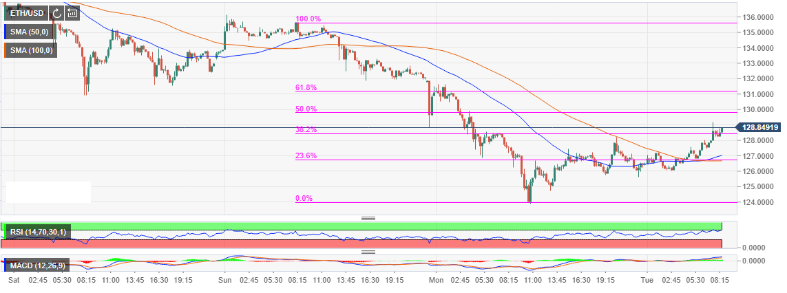 The bearish trend on Monday saw Ethereum correct further to the south breaking below the support at $130 and $125. The bulls, keen to prevent decline below $120, drew a line in the sand at $124. There has been an upside correction above $125 and the Simple Moving Averages (both the 50-day SMA and the 100-day SMA).
