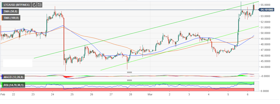 Litecoin was yesterday’s market leader with gains of more than 15%. From the key support at $45.00, the buyers pushed the digital asset above $50. There was a hiccup where the price struggled unable to break past $54.00. However, the bulls managed to extend the leg above the critical $55 forming a high at $55.61.
