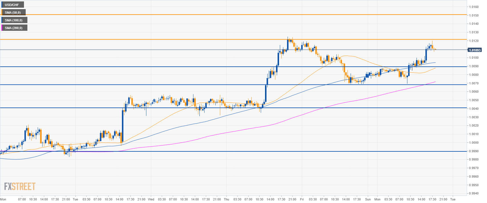 • USD/CHF is trading in a sideways trend above its main simple moving averages (SMAs).
