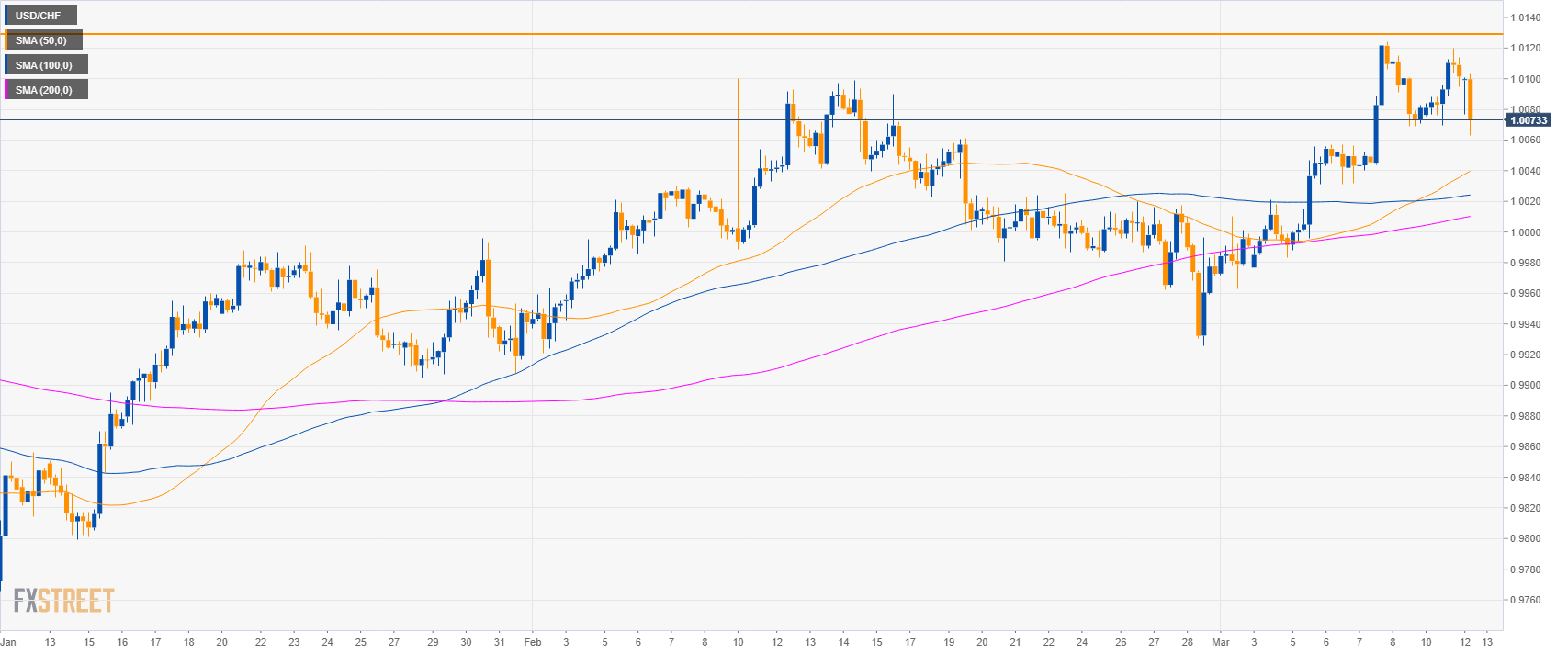 - USD/CHF is trading below the 50 and 100 SMAs suggesting a weakening bull trend.