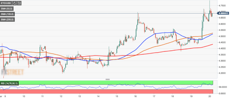 Looking technically, the initial support lies with $4.51-$4.52 (SMA100 and SMA50, 1-hour chart). Once this area is passed, ETC/USD may proceed towards $4.44 and $4.43 (SMA50 4-hour and SMA200, 1-hour respectively). On the upside, the key focus is on the intraday high ($4.72) followed by psychological $5.00.