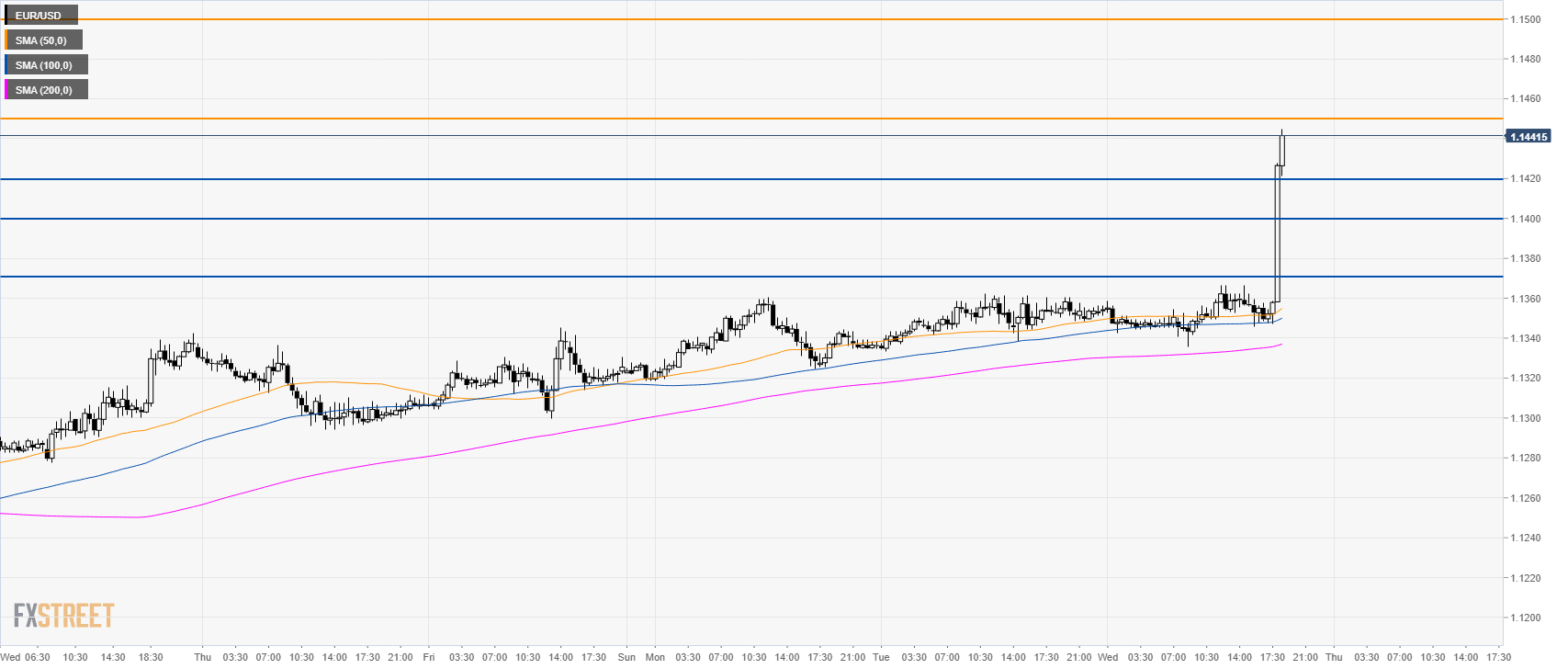 - EUR/USD is testing the 1.1450 key resistance. The next resistance is at 1.1500 figure.