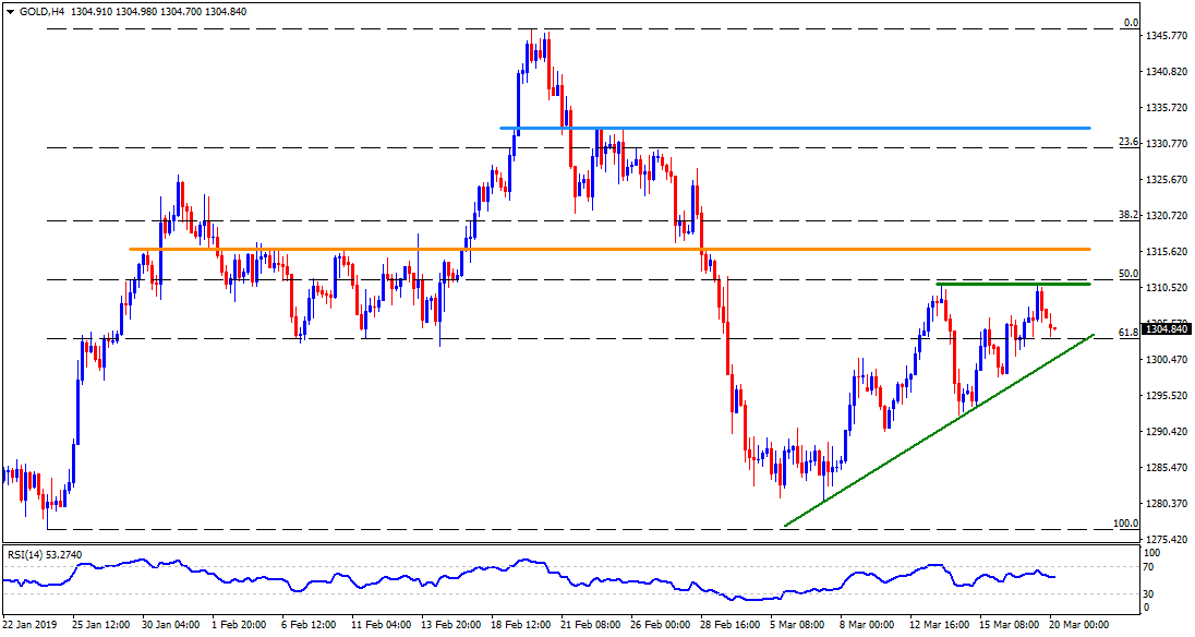 - The yellow metal recently reversed from 50% Fibonacci retracement of its January 24 to February 20 upmove, which in turn can drag the quote towards an upward sloping supportline stretched since March 07, at $1300 now.