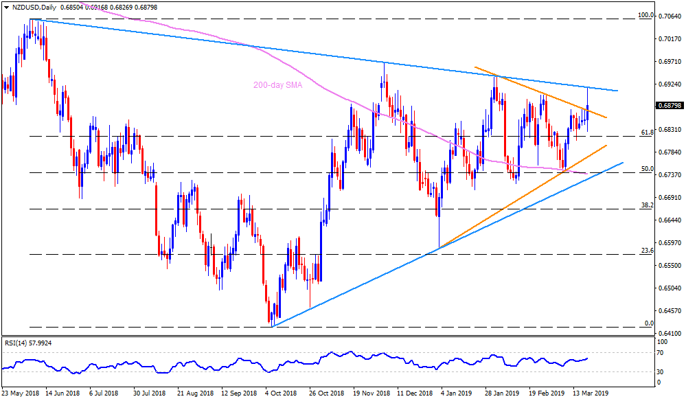 • The quote recently surged past seven-week-old descending resistance-line, at 0.6870, but is still behind the nine-month-old downward sloping trend-line stretched since June 2018, at 0.6920, ahead of the New Zealand Q4 2018 GDP.
