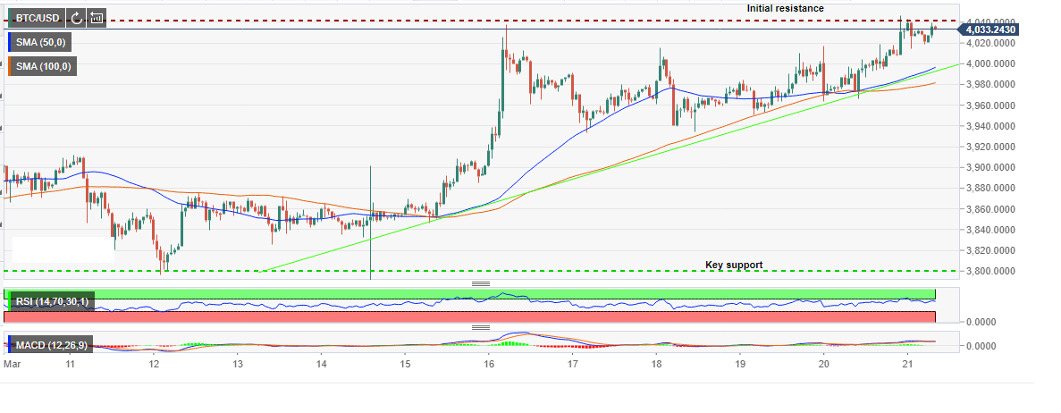 Bitcoin has been on an upward trajectory since March 12 when it found support at $3,800. This is not to say that the ride has been a smooth one. Last week Bitcoin struggled and broke past $4,000 but failed to make any significant movement above $4,040. As a result, the trend reversed to the current short-term support at $3,960. In the last three days, the bulls have been pushing for another correction. Their efforts were rewarded during the Asian trading session today where BTC/USD cleared the stubborn $4,000 zone. Highs were formed at $4,040 (initial resistance) and Bitcoin has corrected to the current value at $4,032.91. The bulls are working hard to form support above $4,000 in order to gather strength to attack the medium-term hurdle $4,200.