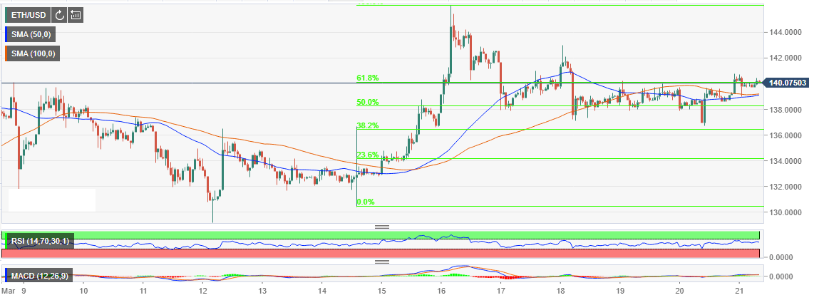 Ethereum, on the other hand, reacted alongside Bitcoin rise above $4,000 breaking the resistance at $140. After trading highs around $140.72, the crypto is flirting with the 61.8% Fib level 1-hour at $140.08. Bullish momentum has slowed down but indicators like the RSI and the MACD show that the sideways trading is taking over. Besides, ETH/USD is supported by both the 50 SMA and the 100 SMA 1-hour. Other support levels to look out for are $138.00, $132 and $129.