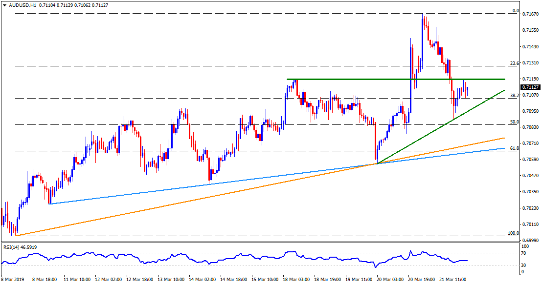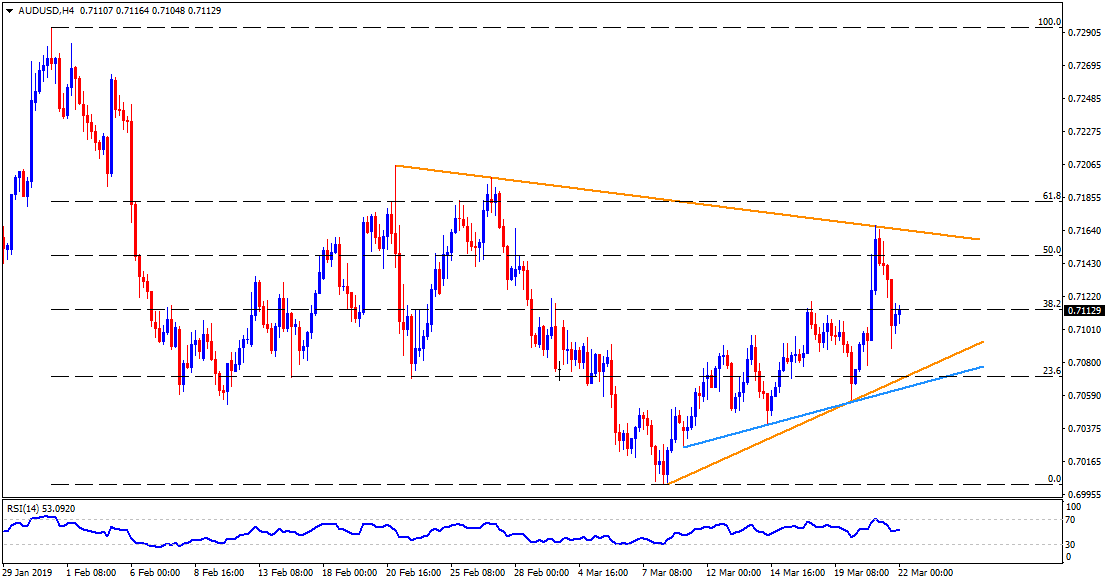 - 50% Fibonacci retracement of January 31 to March 08 downturn at 0.7150 can provide an intermediate halt between 0.7130 and 0.7150.