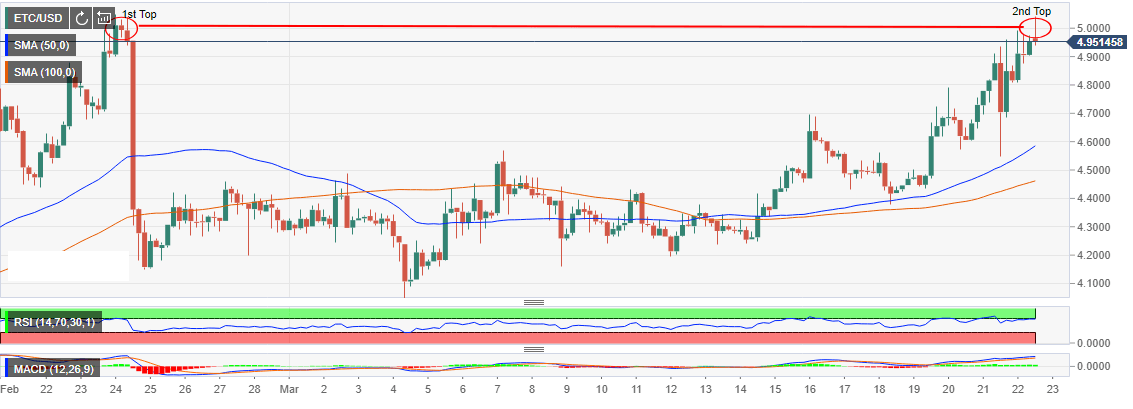 The buyers did not, however, stay down for long as they staged a reversal that broke above $5.0 for the first time in March. According to the data provided by FXStreet cryptocurrency live rates, ETC/USD has added 2.82% to its value to exchange hands at $4.95.