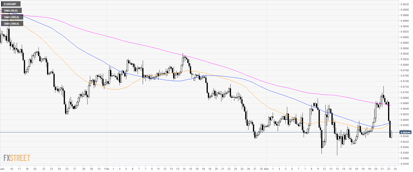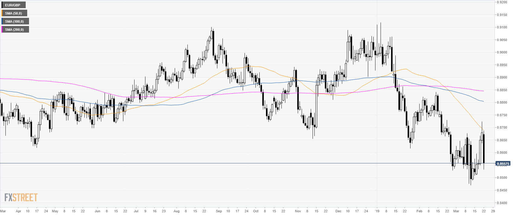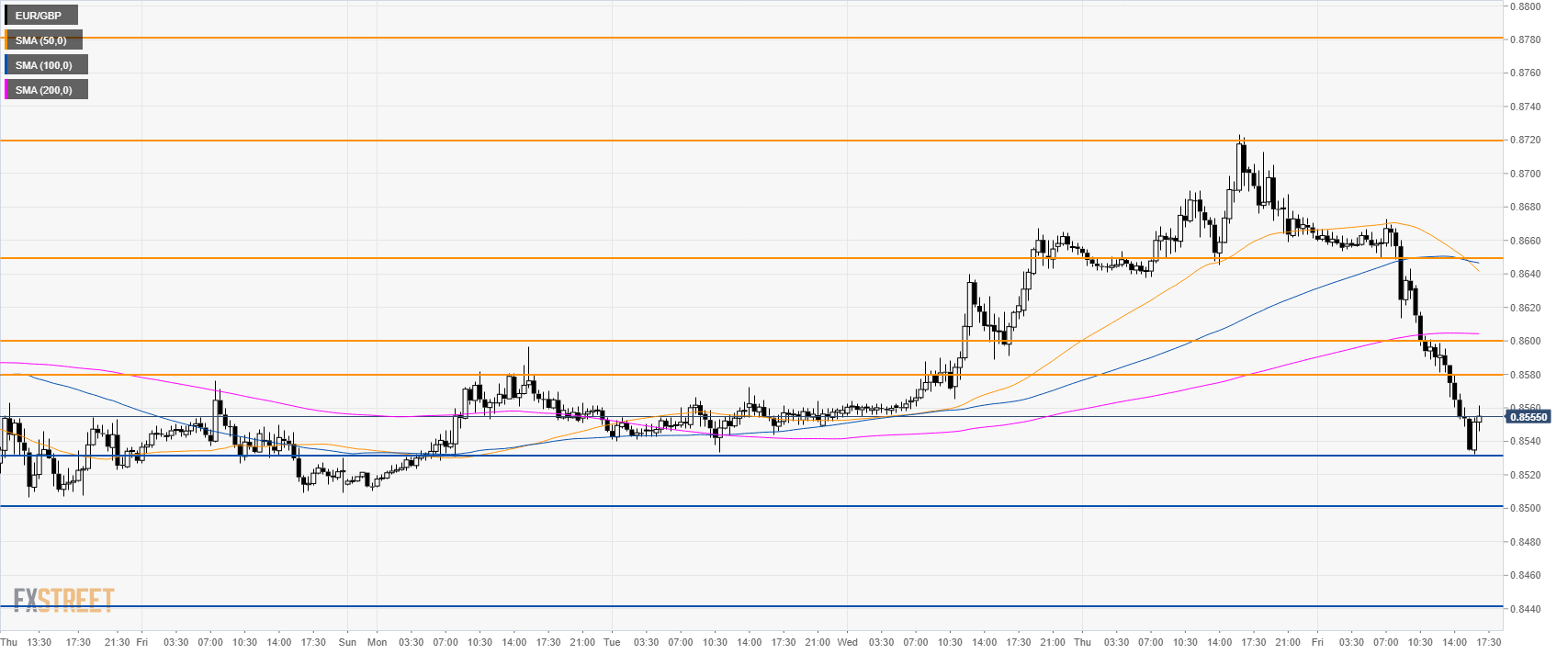 • EUR/GBP is trading in a sideways trend below its main simple moving averages (SMAs).
