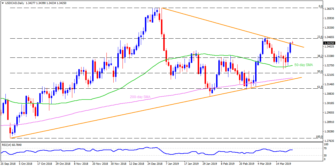 - In spite of breaking 12-week old descending trendline, the USD/CAD pair struggles around 1.3430 ahead of European open on Monday.