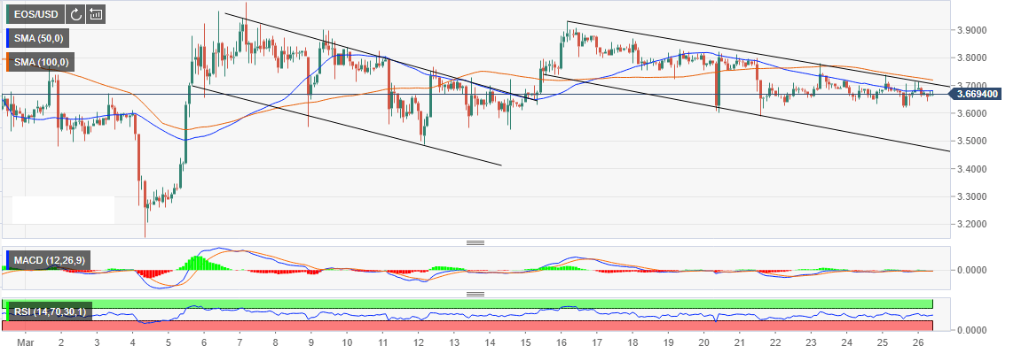 The downtrend trend is forming a descending channel similar to one that resulted in EOS/USD recovery from $3.5 support to test $4.0 on March 16. The forming descending channel is closing in for a breakout that could send EOS on an upward trajectory above $4.0.