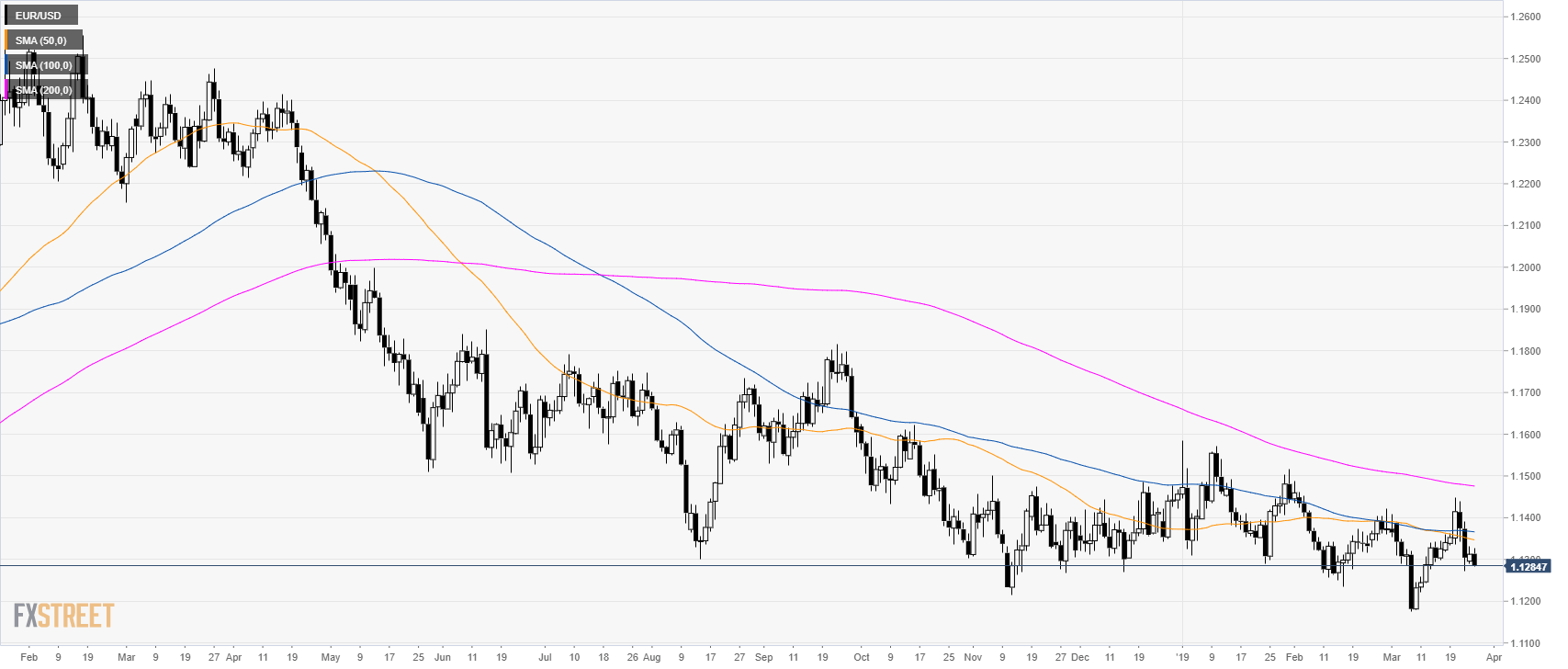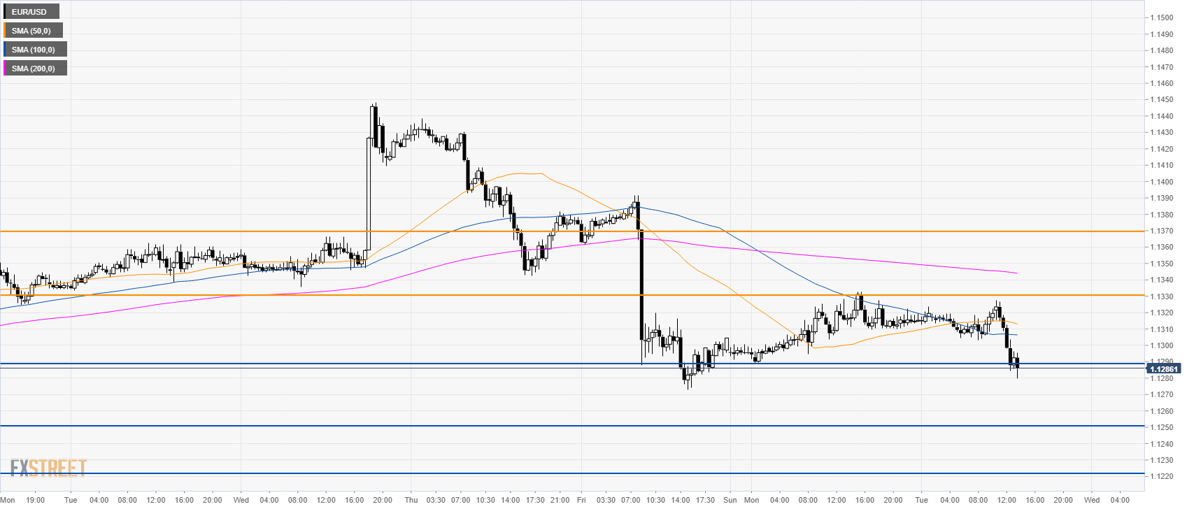 - EUR/USD is breaking below 1.1290 support. Looking down, the next supports are at 1.1250 and 1.1220 level.