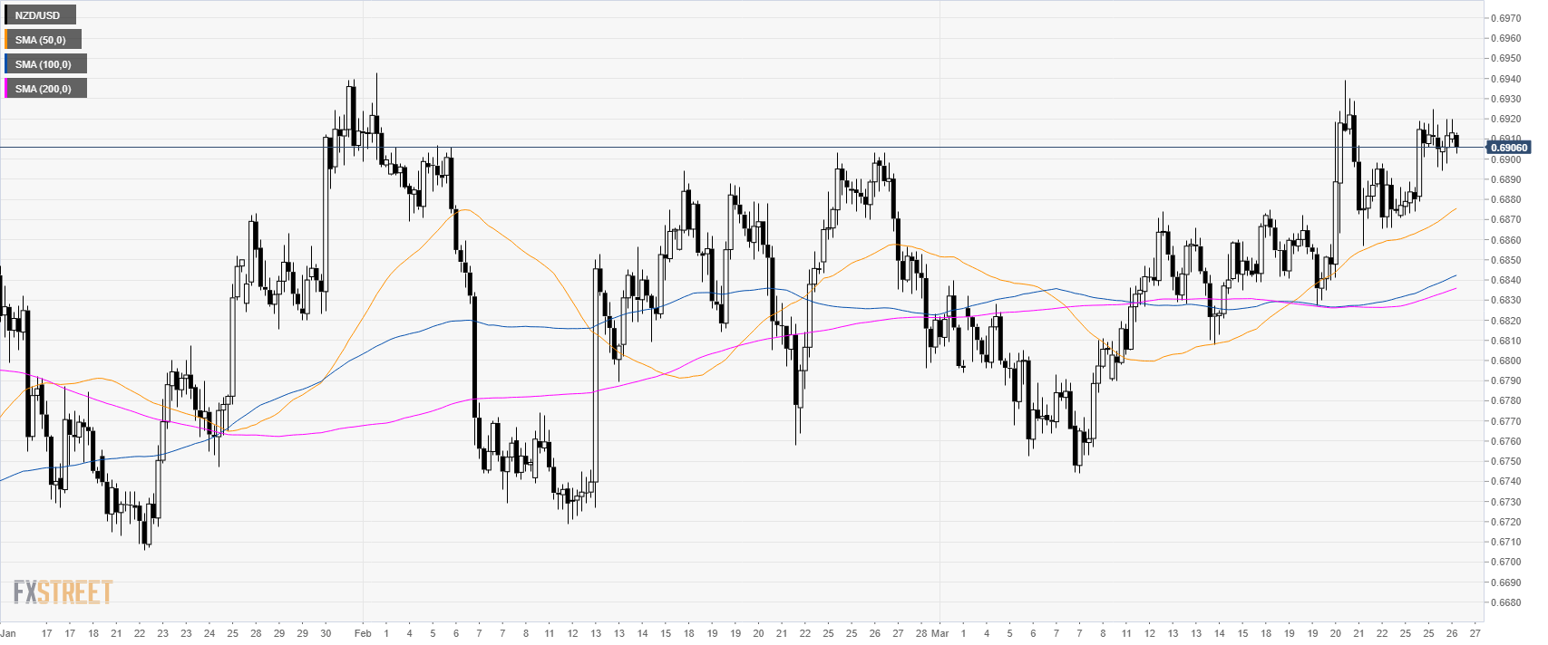 • NZD/USD is trading between its 50 and 100 SMA suggesting a consolidation in the short-term.