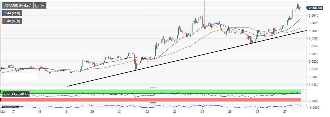 Cardano has been on an upward trajectory since the beginning of March. Over the last three weeks, the crypto has increased 35% to trade at $0.066 at the time of press. In the last 24 hours, Cardano has witnessed a 10% rise.
