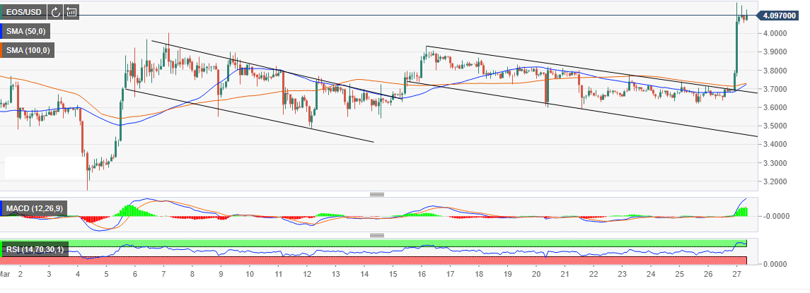 Meanwhile, as predicted yesterday, EOS spiked in gains breaking out of the descending channel. The channel resembled one that had towards mid-March which resulted in a reversal where EOS/USD traded close to $4.0. The current gains have sent EOS/USD above the critical $4.0, besides EOS is trading at $4.1. The 50 SMA is almost crossing above the 100 SMA 2-hour to show that the bulls are still gaining traction against the bears. Signals from the indicators are strongly positive hence retracement to $5.0 is a possibility.