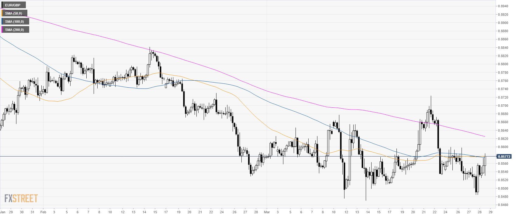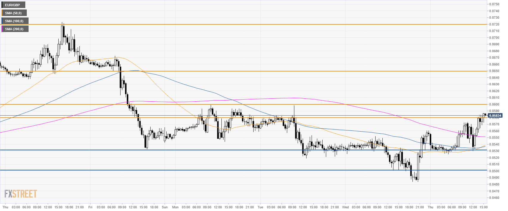 • EUR/GBP is challenging 0.8580 key resistance. A break above the level would open the doors to 0.8600 and 0.8650 resistances.