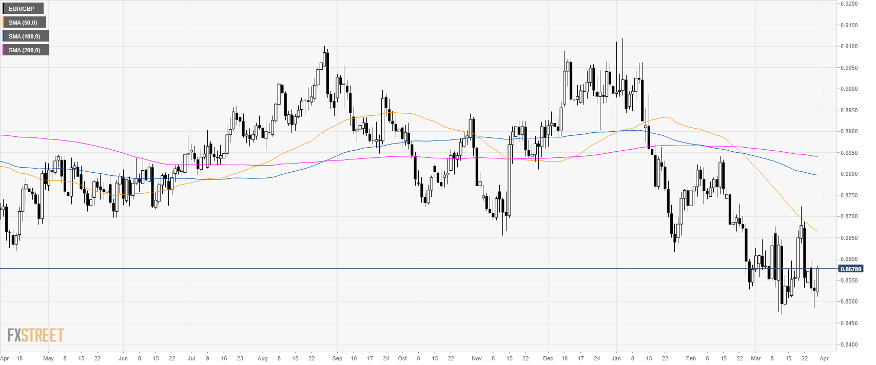 • EUR/GBP is trading in a bear trend below its main simple moving averages (SMAs).