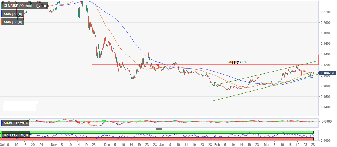 Several bullish attempts have not been able to break past the channel resistance with any success. Following the substantial gains on March 19, XLM batted the resistance but came short of the supply zone at $0.12 leading to another downside correction.