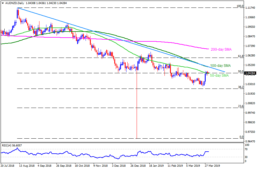- Should the pair manage to clear 1.0455 immediate resistance, it can head towards 1.0500 resistance-confluence comprising 100-day SMA and a downward sloping trend-line since August 2018.