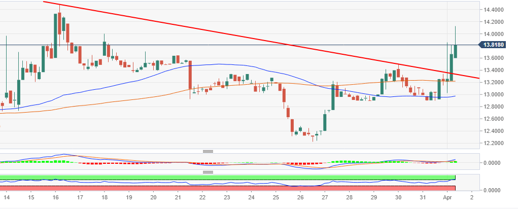 According to the 4-hour chart, the swing above the trendline resistance is supported by the 100 SMA (in red) currently at $13.0. A bullish candlestick has engulfed the previous bearish candle to show that the price has the potential to trend higher above the current value $13.81.