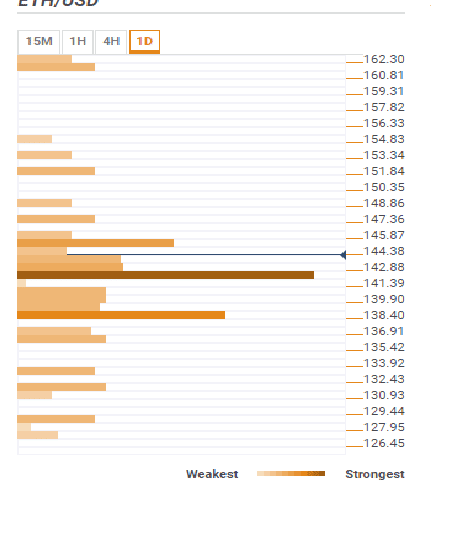 Marginally above the current price, the first resistance rests at $144.38. The level has been highlighted by a confluence of indicators including the 5 SMA 1-hour, previous high 15-minutes, previous high 1-hour, previous high 4-hour, Bollinger Band 15′ upper and the Bollinger Band 1-hour upper. If Ethereum manages to retrace above this level, it will encounter another resistance level at $145.87 marked by the pivot point 1-day R3 and the Bollinger Band 4-hour upper. To jump above $150, the bulls must clear other minor hurdles at $147.56 and $148.86.