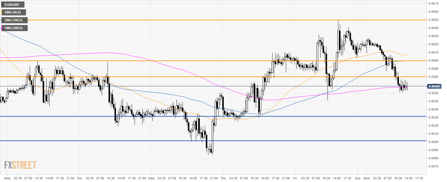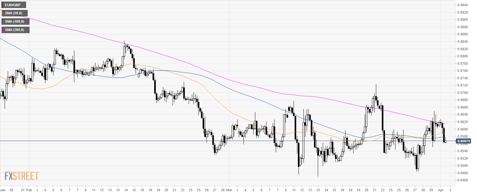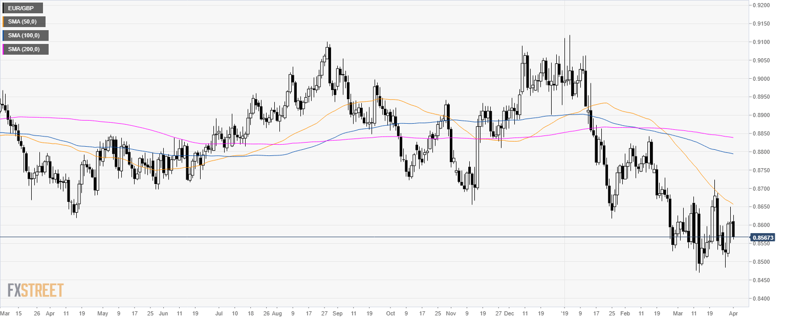 - EUR/GBP is trading in a bear trend below its main simple moving averages (SMAs).
