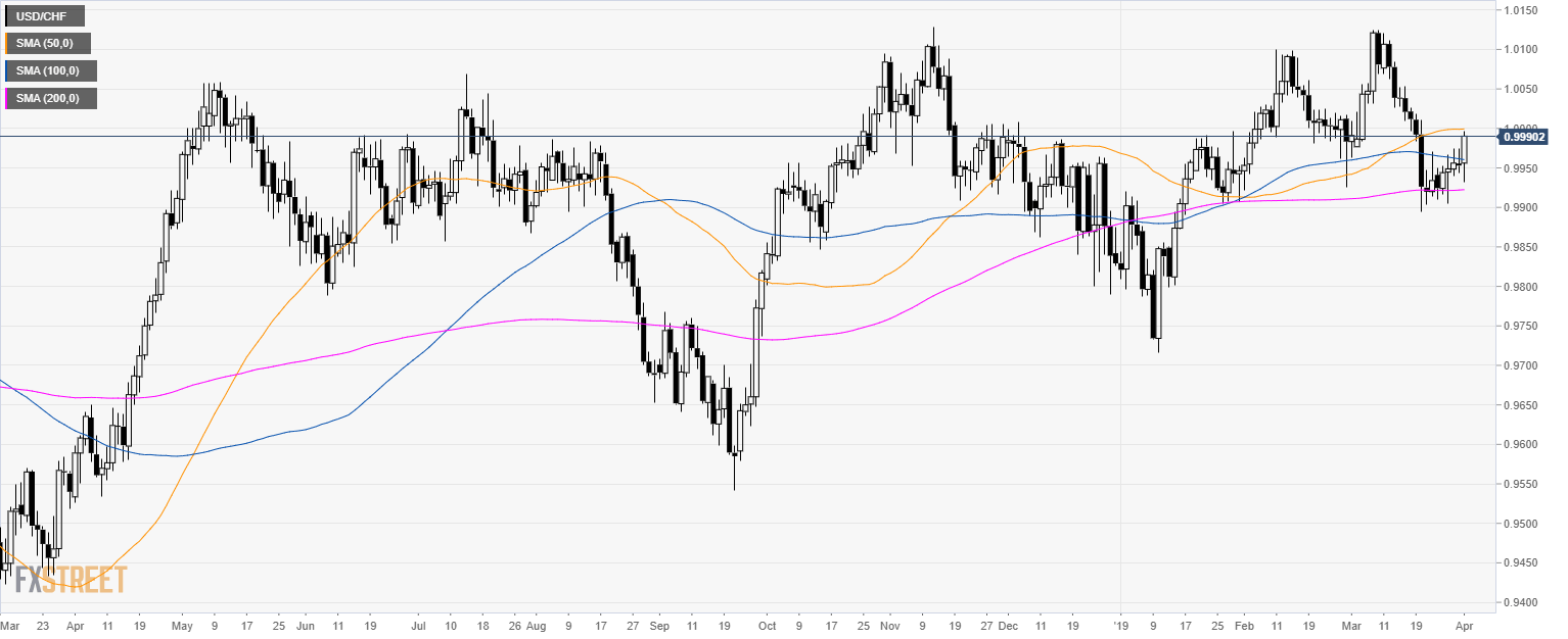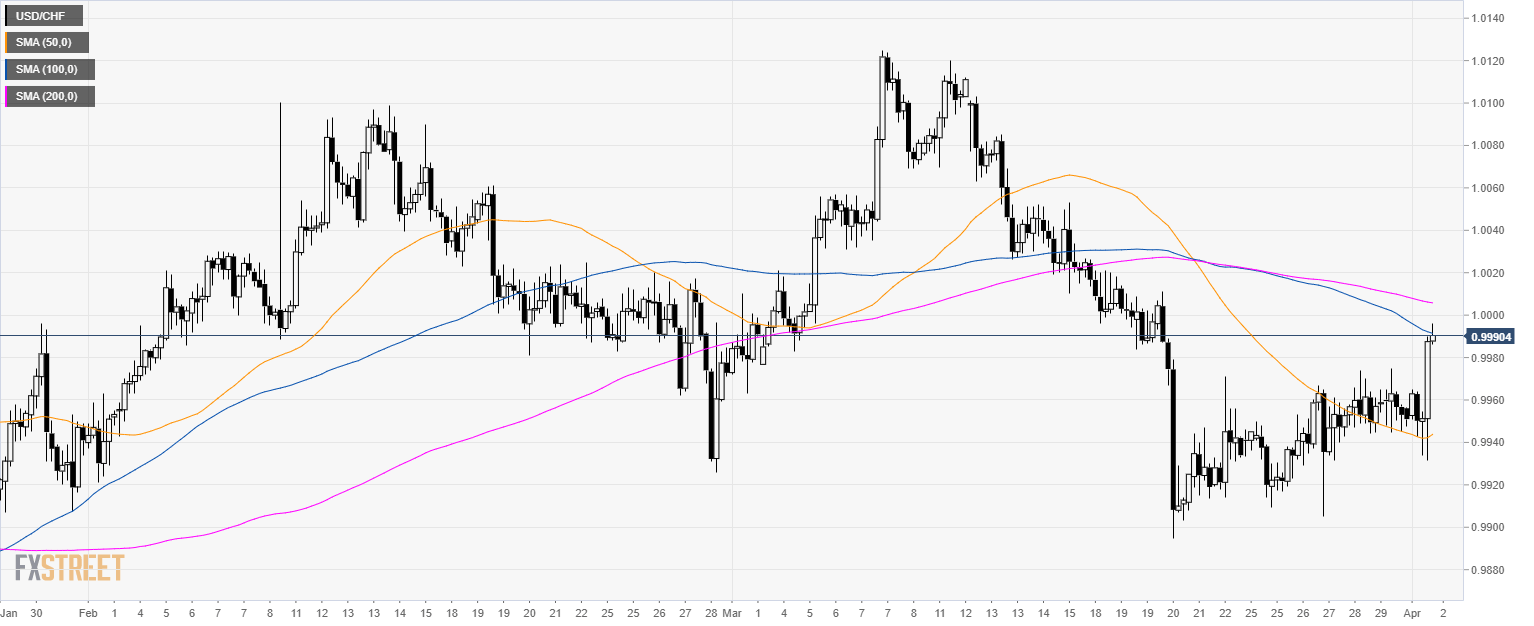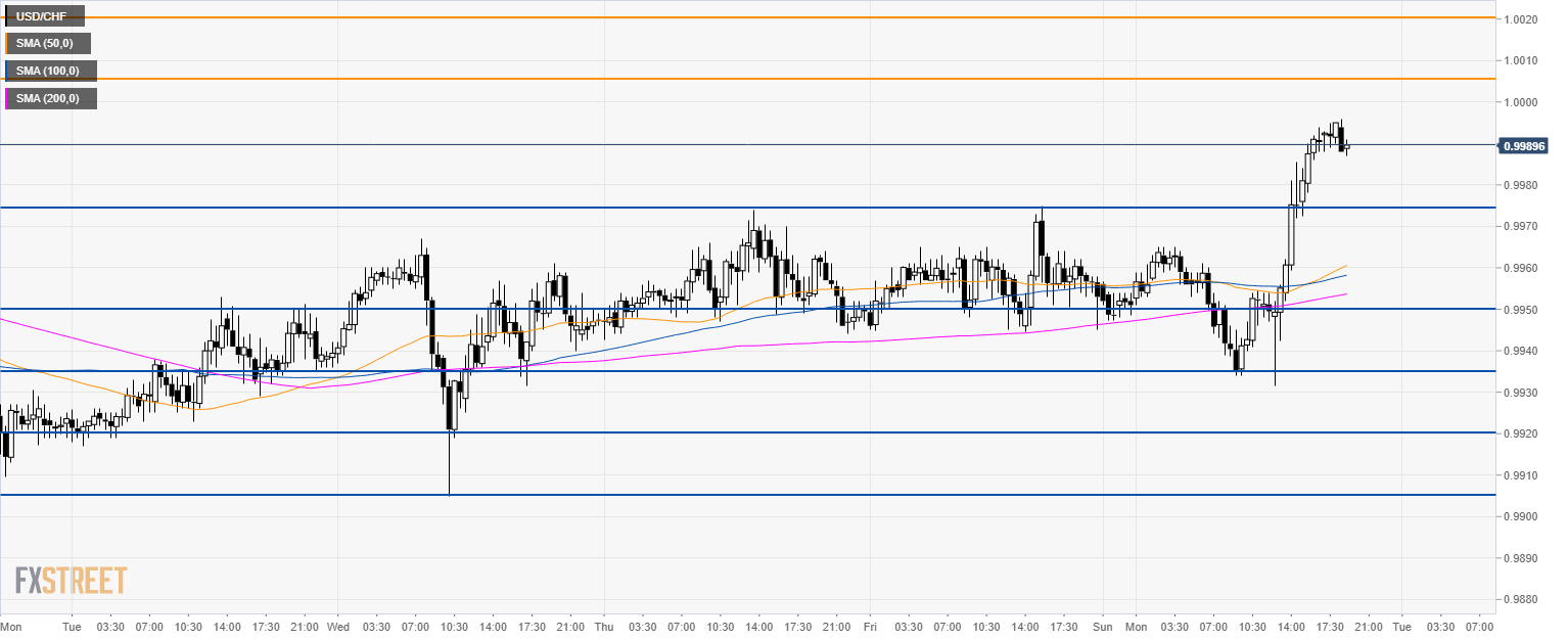 - USD/CHF is trading in a sideways trend just below the parity level.