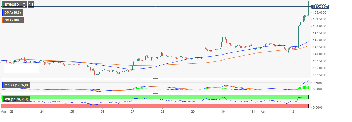 At the moment, with gains of more than 10% on the day, it is only a matter of time before we witness a correction above the $160 hurdle. Meanwhile, ETH/USD is dancing at $157.09. The RSI 1-hour has revamped the trend upwards inside the overbought while the MACD in the same range at +3.39 is still sloping upwards.