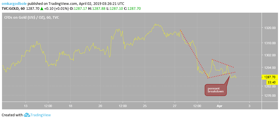 Gold is trading on the defensive at $1,287 and could drop to $1,281 (March low) in the next day or two, as the path of least resistance is to the downside, according to the pennant breakdown seen in the hourly chart.