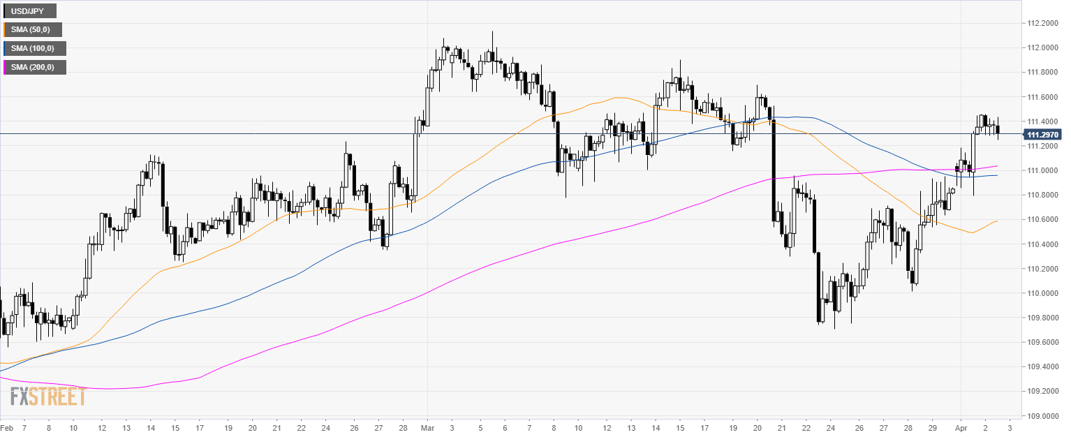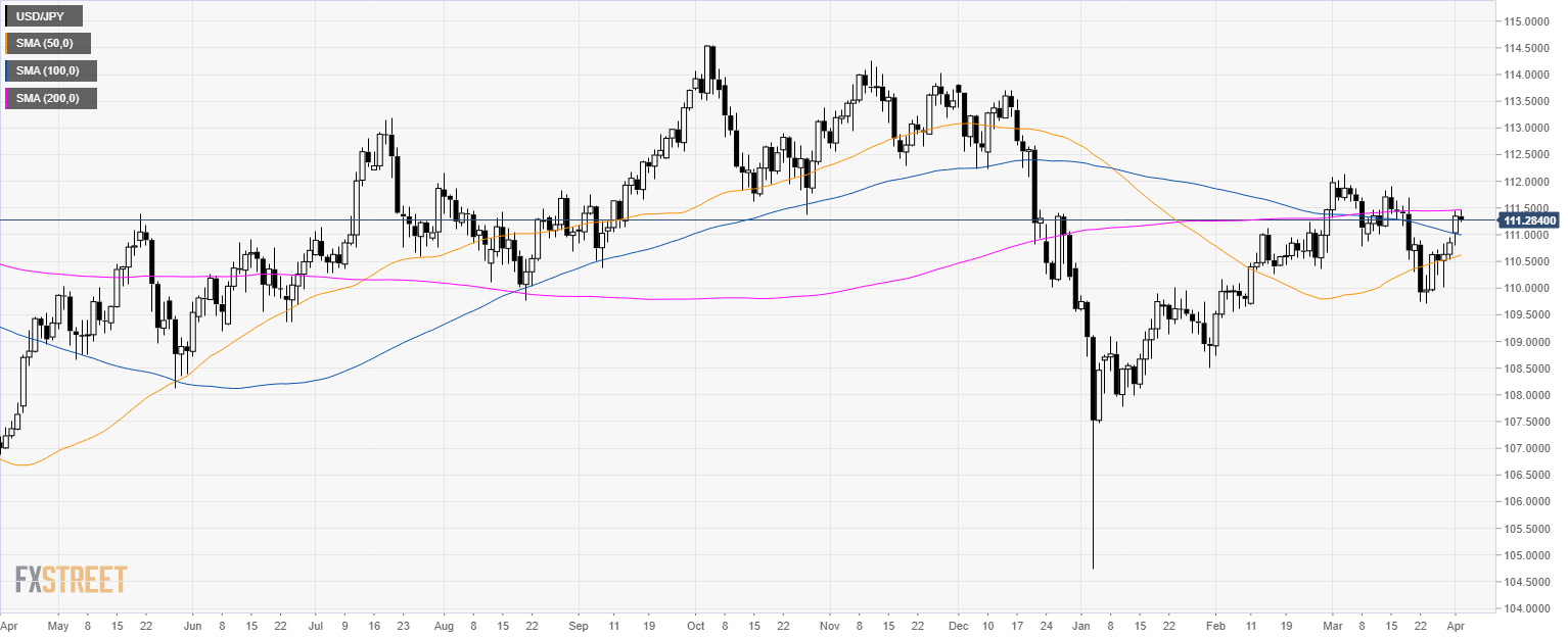 • USD/JPY is consolidating just below the 111.50 resistance and the 200-day simple moving average (SMA).